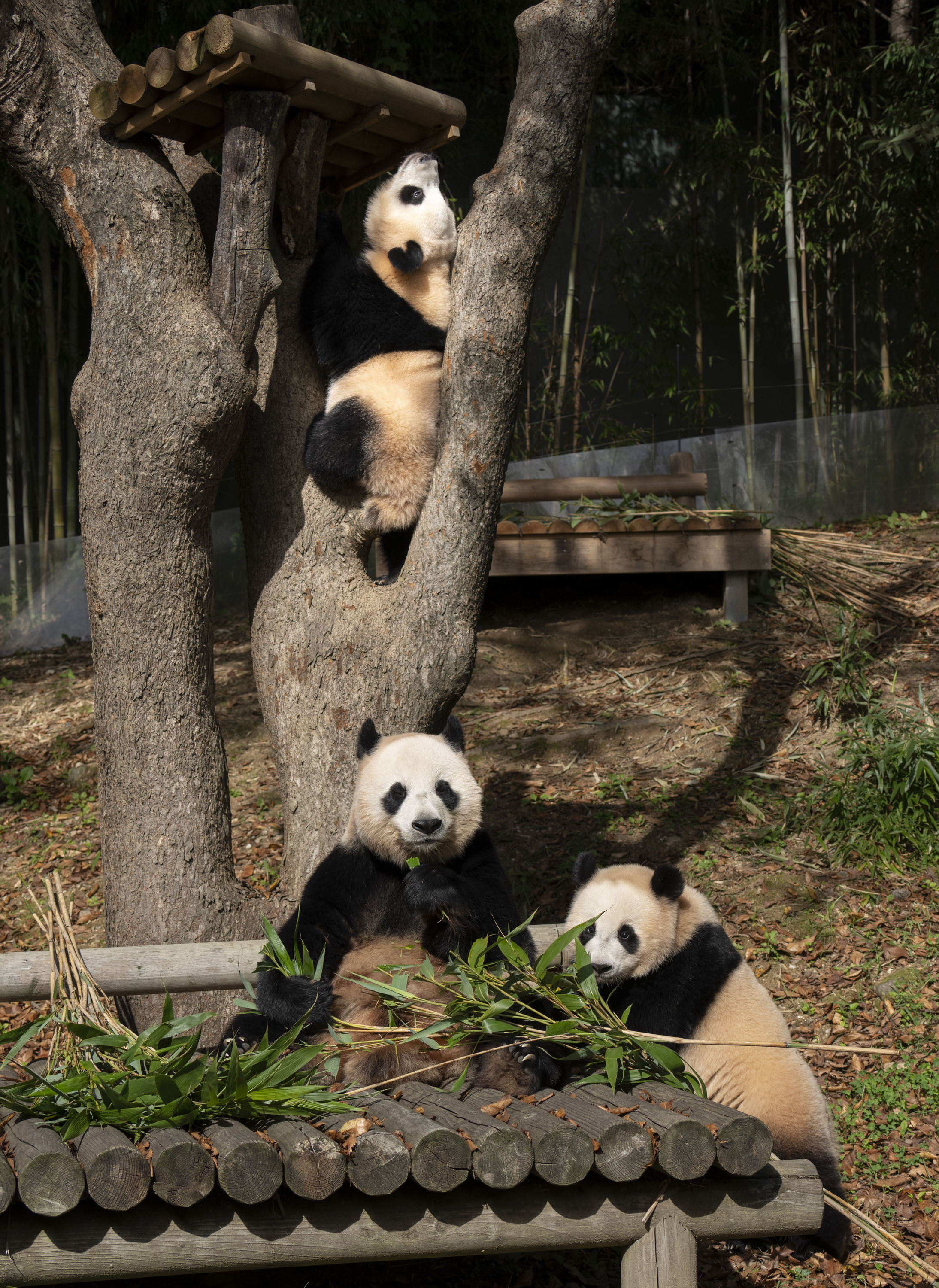 완연한 가을 날씨를 보인 3일 오전, 용인 에버랜드에서 쌍둥이 아기 판다 루이바오, 후이바오가 엄마 아이바오와 함께 야외 나들이를 즐기고 있다.