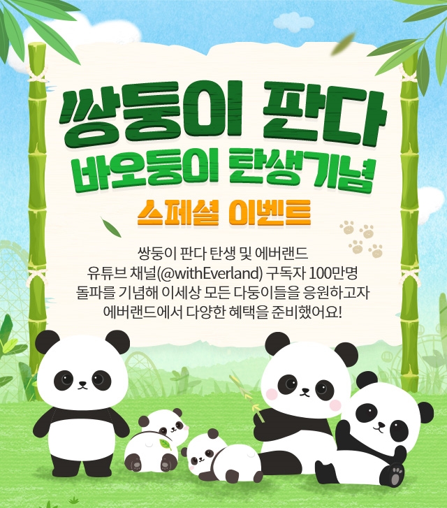 삼성물산 리조트부문(사장 정해린)이 운영하는 에버랜드가 국내 최초 쌍둥이 판다 탄생과 유튜브 100만 구독자 돌파를 기념해 고객 감사 이벤트를 진행한다고 27일 밝혔다.
