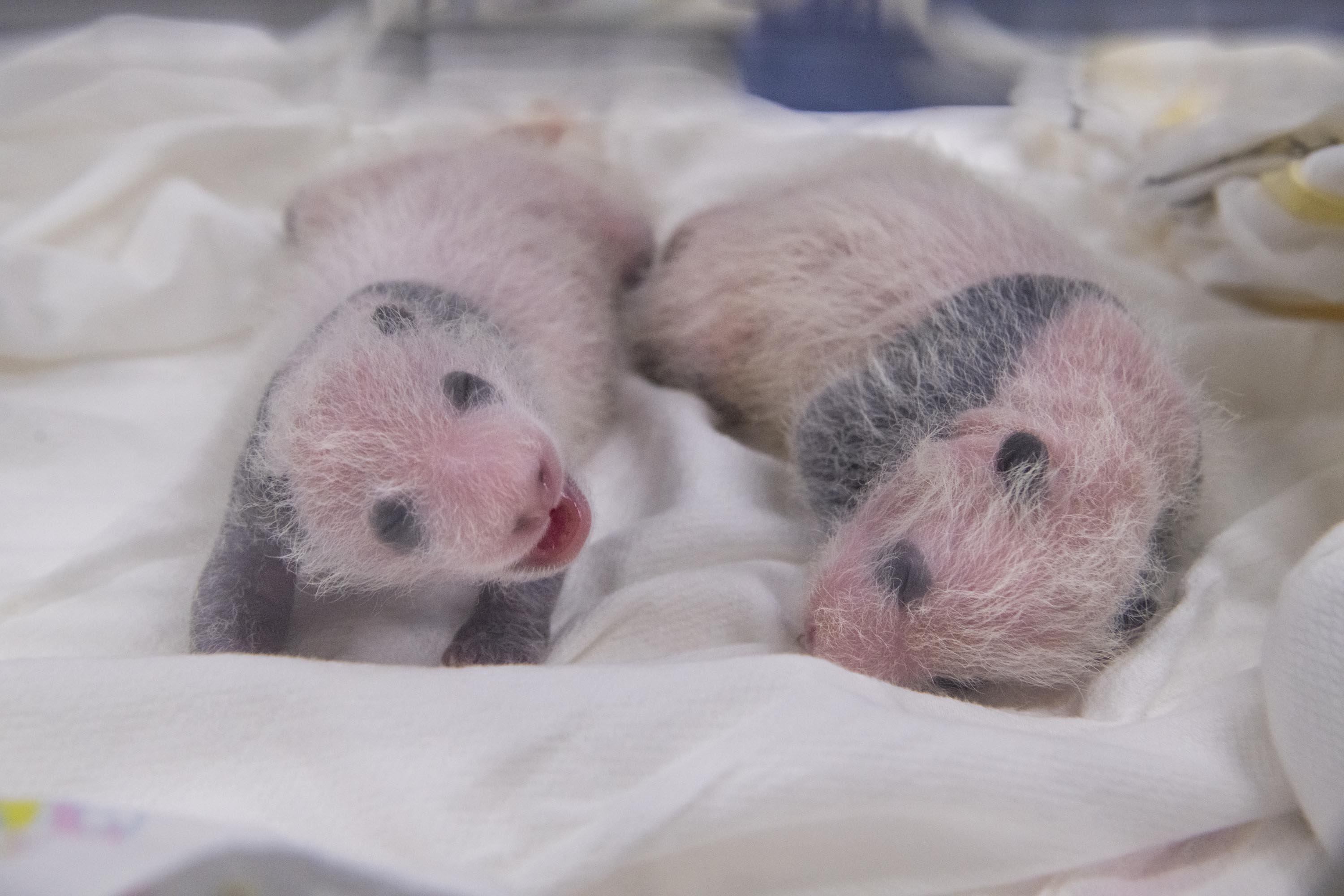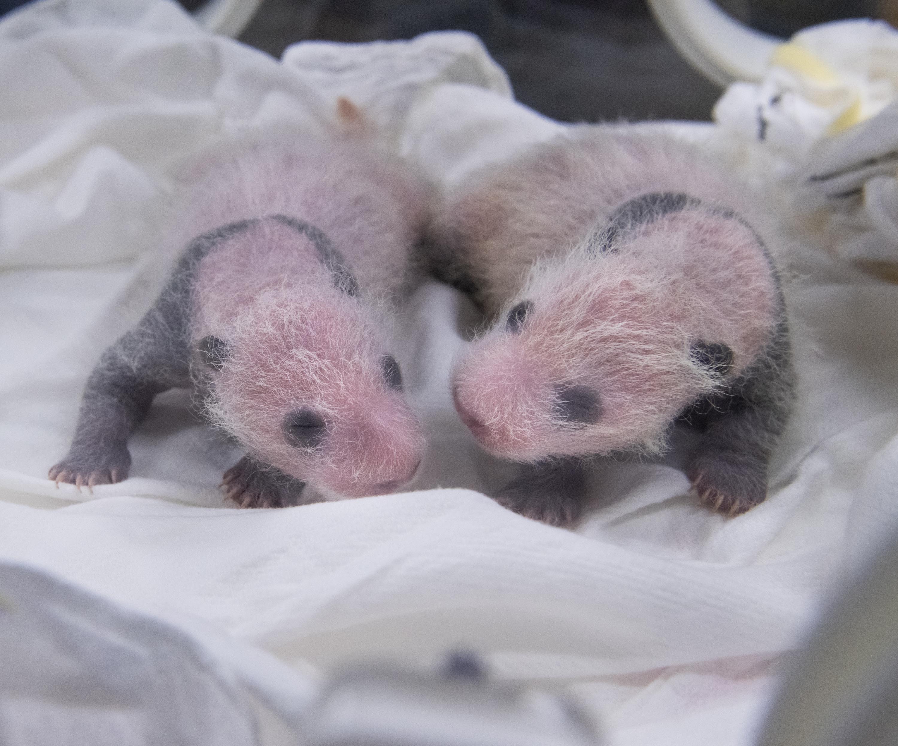 에버랜드 판다월드에는 지난 7일 국내 첫 쌍둥이 판다인 암컷 2마리가 자연 번식으로 태어났고, 현재 눈, 귀, 등, 앞다리, 뒷다리 등 검은털이 자라날 신체 부위에 검정 무늬가 보이기 시작하며 건강하게 성장하고 있다.