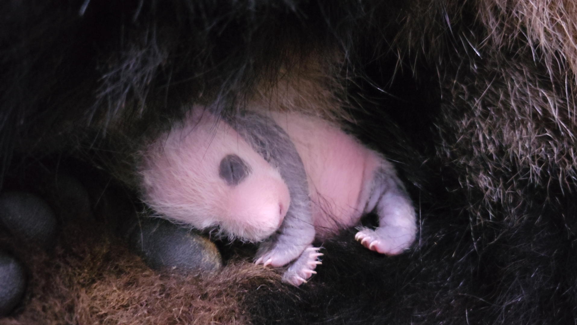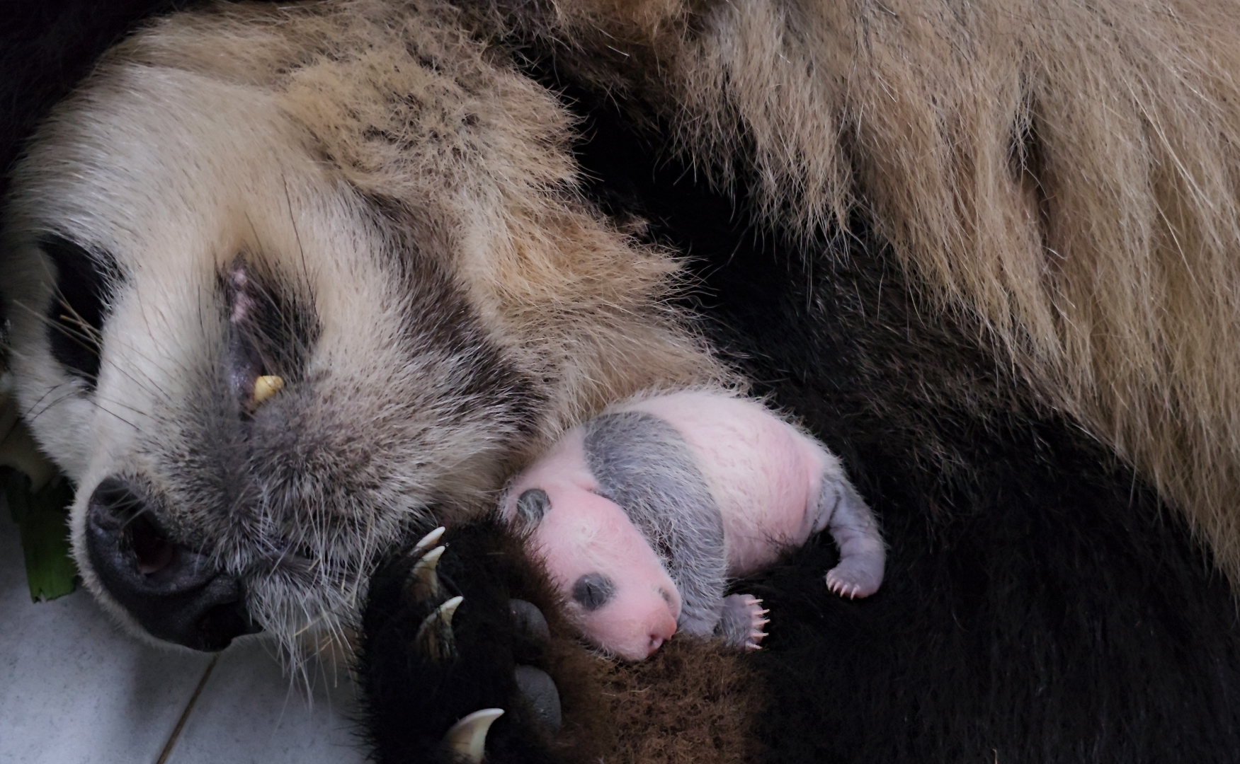 품 안의 아기 판다가 자라남에 따라 아기의 귀여운 모습이 조금씩 개방되고 있습니다.