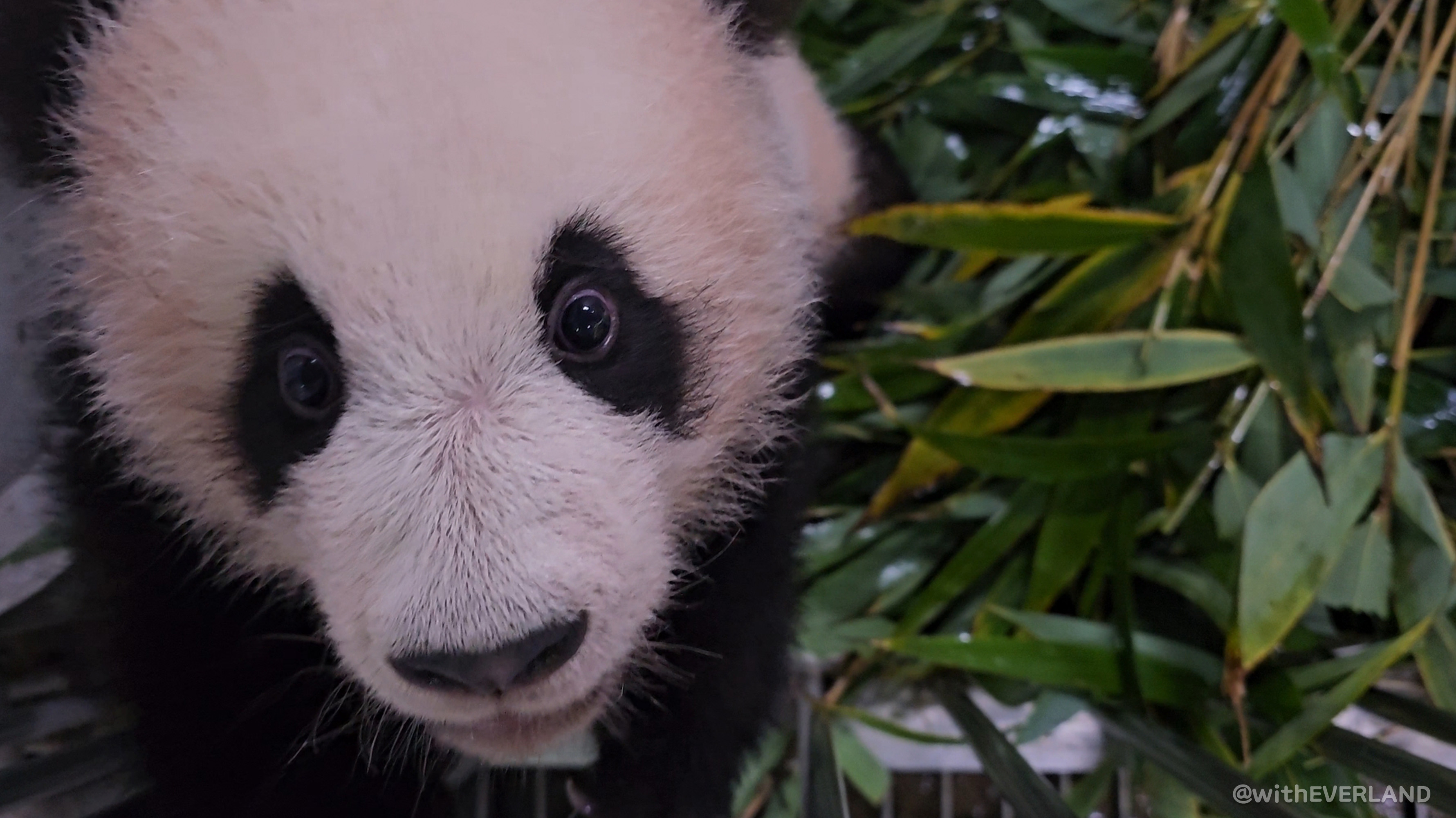 하지만 루이바오가 흰자까지 보이는 땡글땡글한 큰 눈을 보여주고 있고, 누룽지 색의 털 빛깔도 유지해주고 있어서 둘의 구별에 큰 어려움이 없습니다. ^^