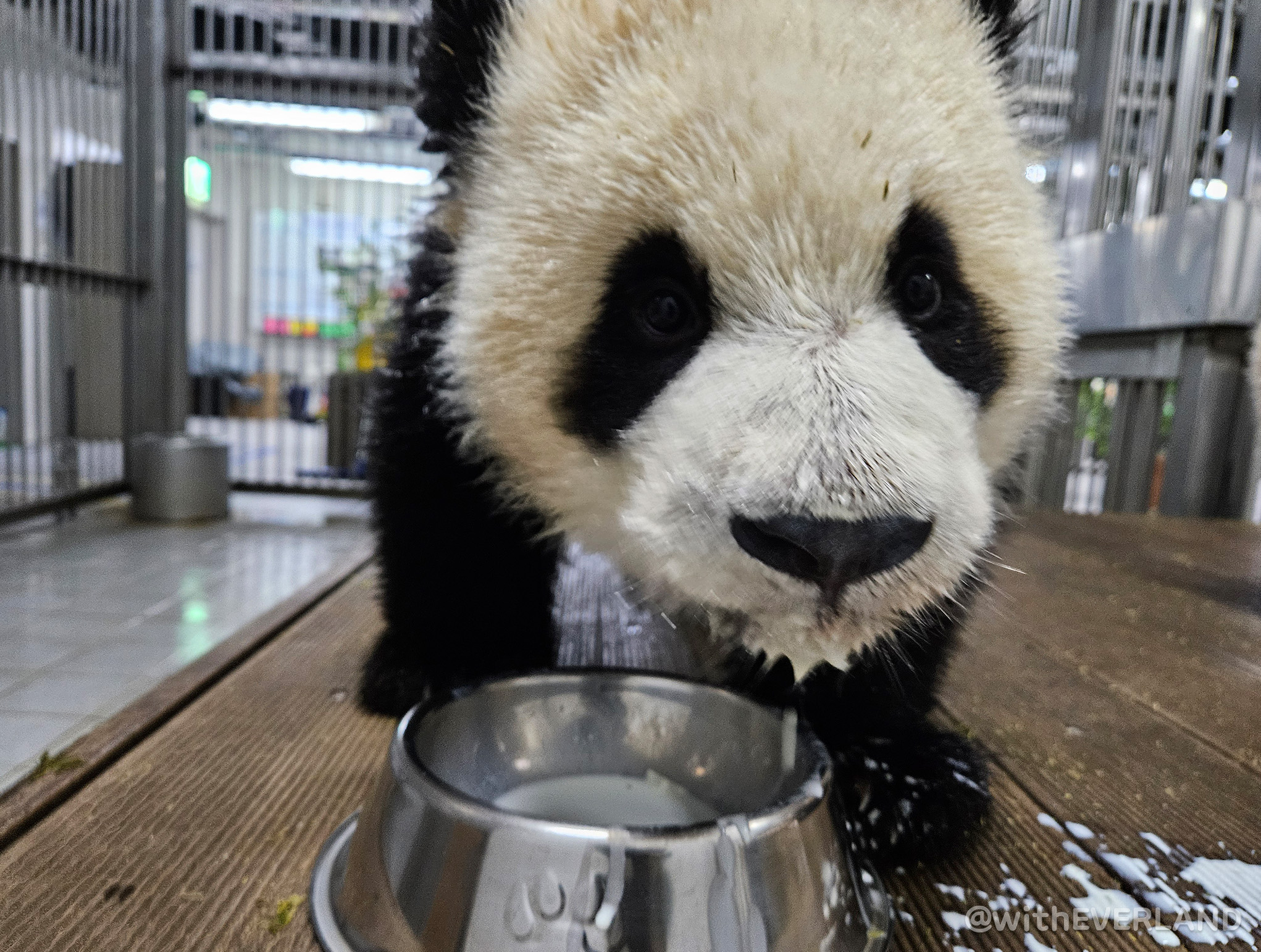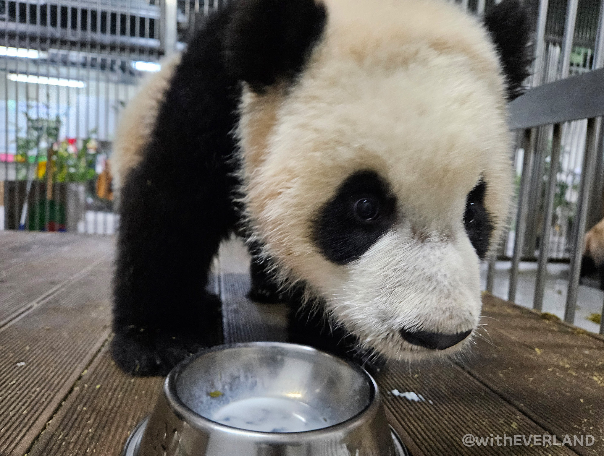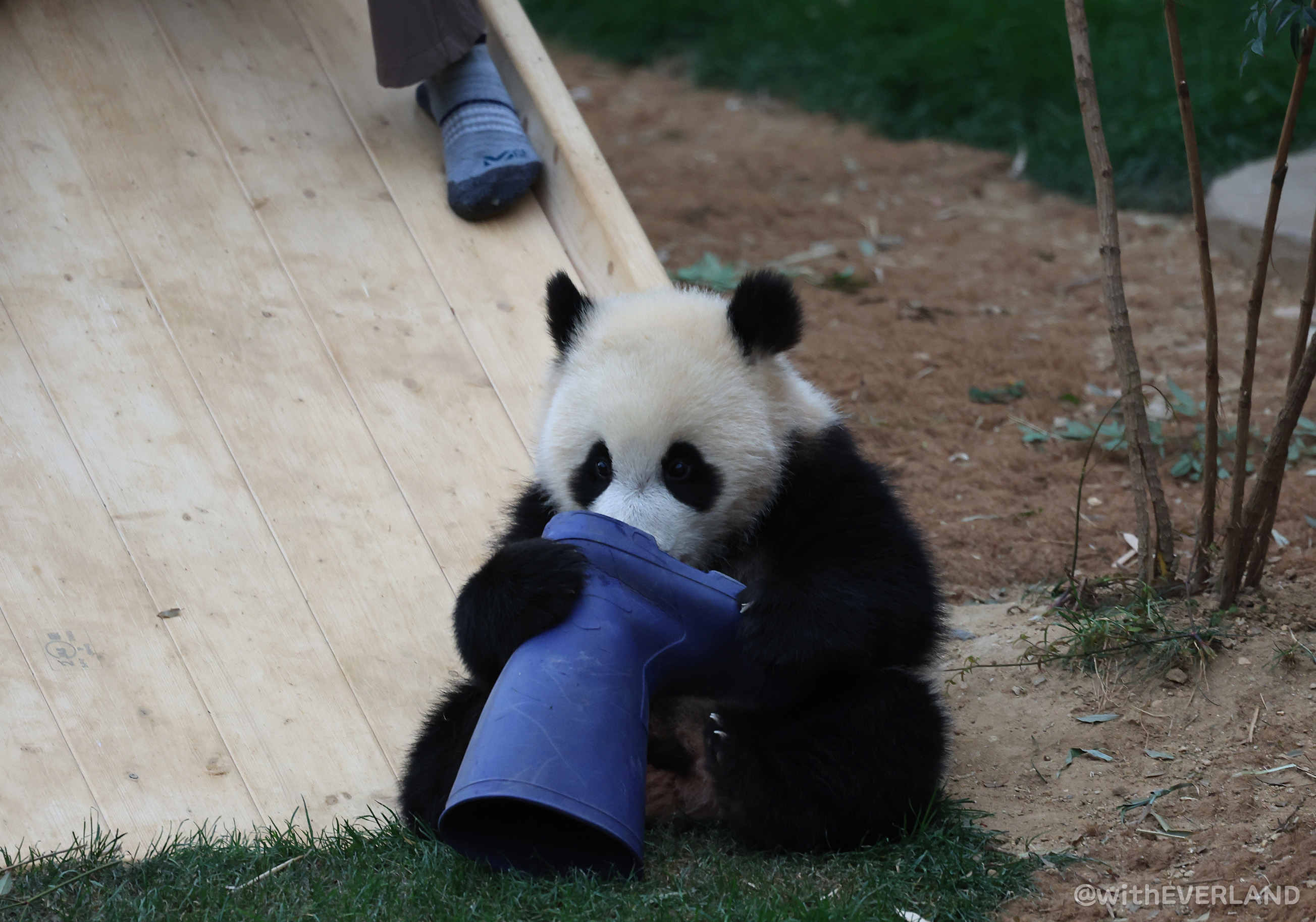 또 아이바오가 야외 외출한 시간을 이용해 쌍둥이들과 열심히 놀아주려고 합니다.